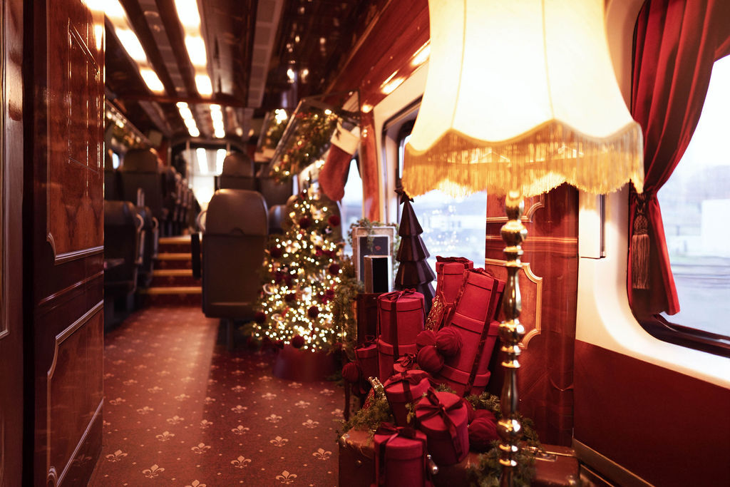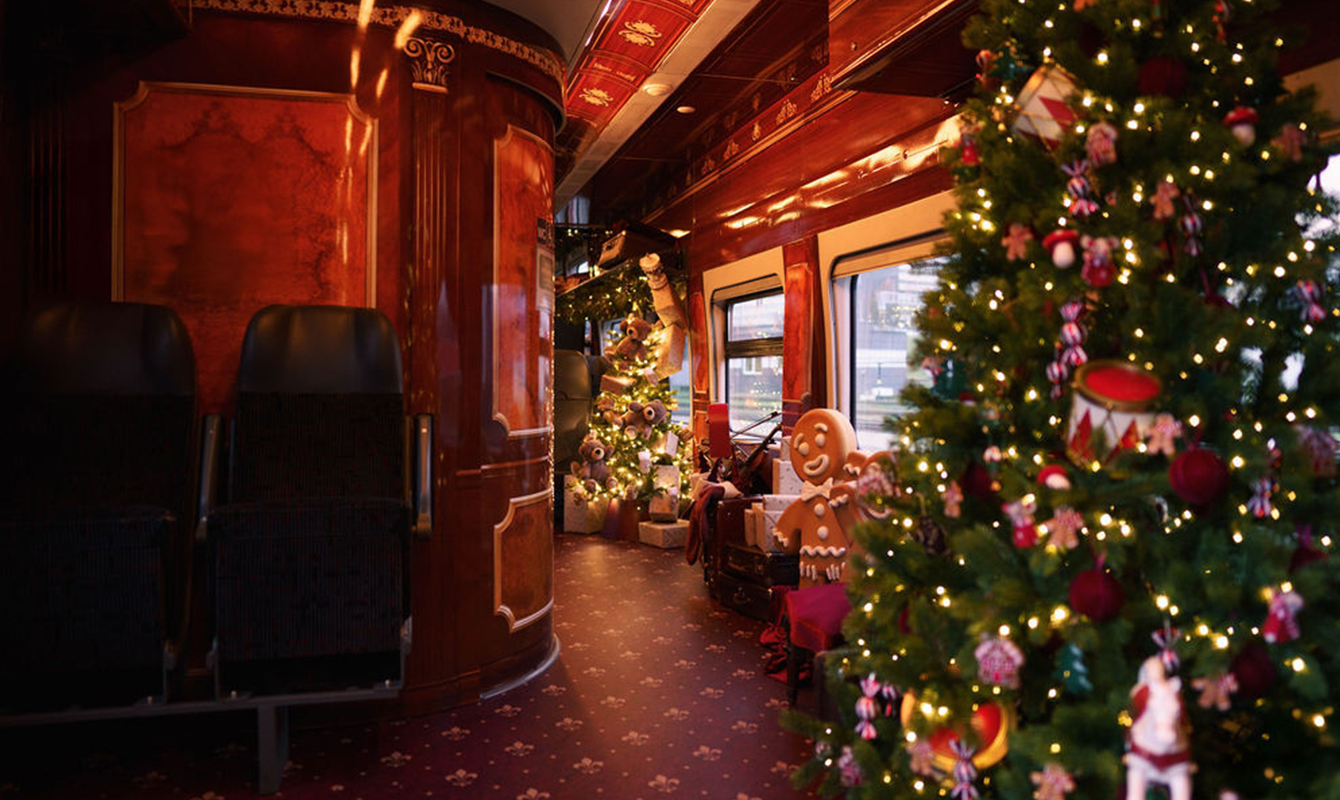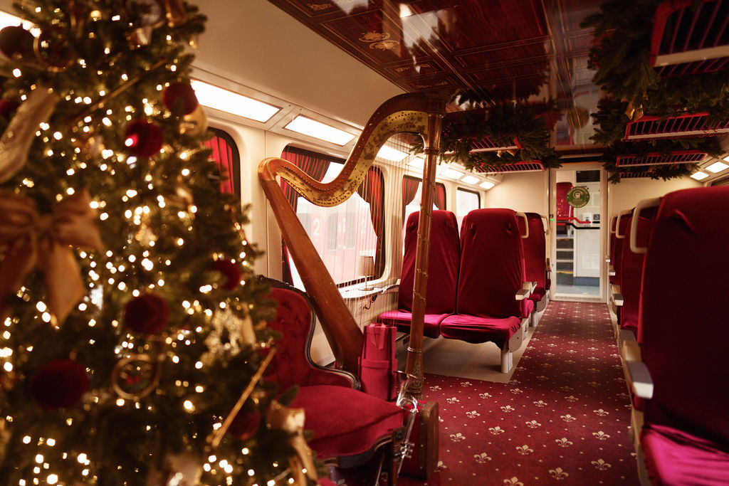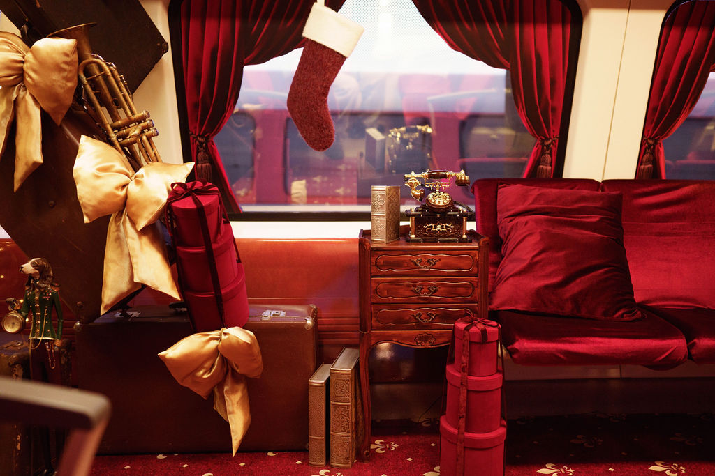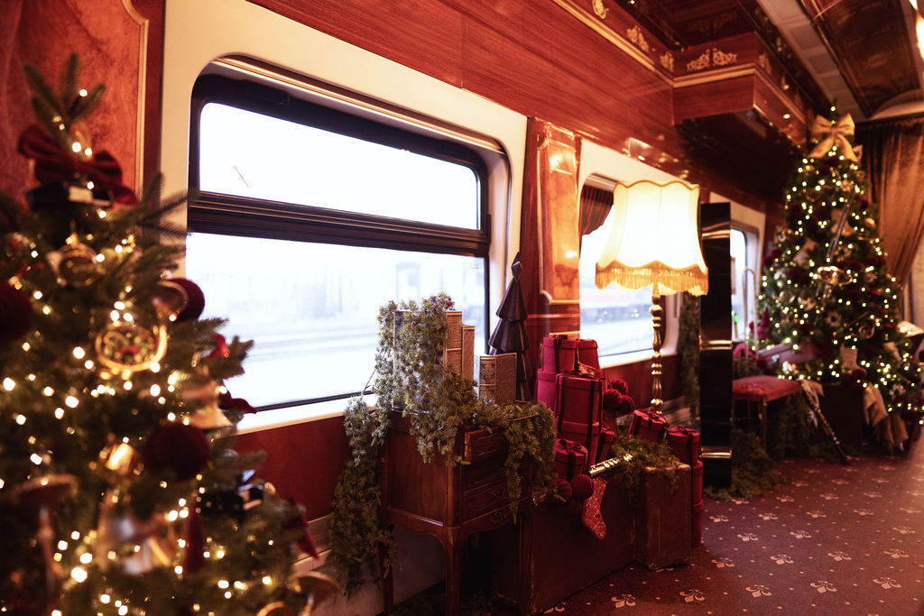 В вагонах создали праздничный антураж: красно-золотые украшения, елки, рождественские музыкальные инструменты, фигурки из пряников и почтовый ящик для писем Санта-Клаусу.
